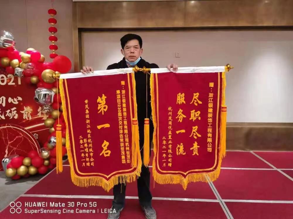 2021年1月20日對(duì)銀建人來說是一個(gè)值得可喜的日子,在世貿(mào)二批次交付評(píng)估世貿(mào)集團(tuán)第一名的成績下,今日正式進(jìn)行了頒獎(jiǎng)儀式,由甲方送來了兩面寫有“第一名”“盡職盡責(zé) 服務(wù)一流”的錦旗和“優(yōu)秀項(xiàng)目經(jīng)理”的獎(jiǎng)杯!