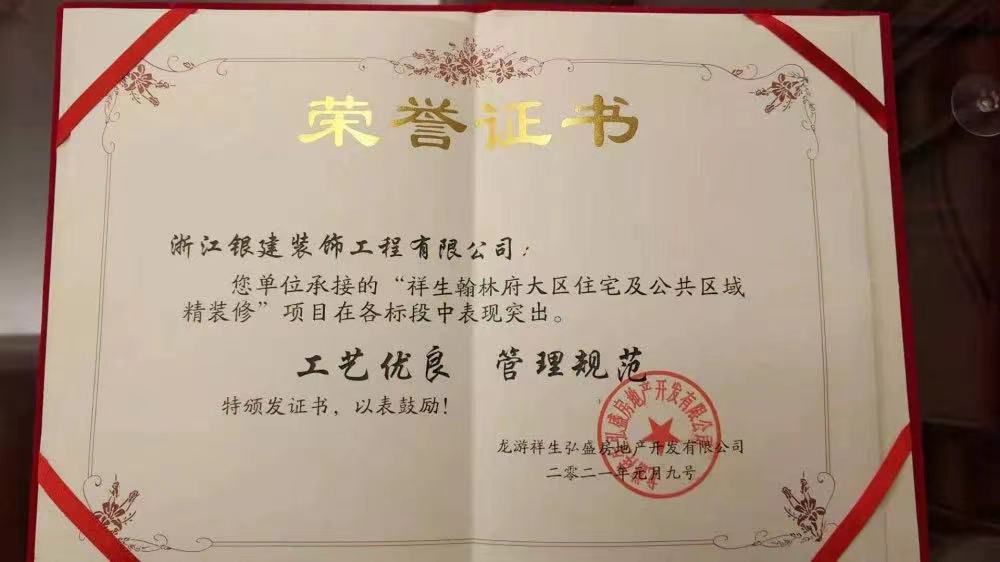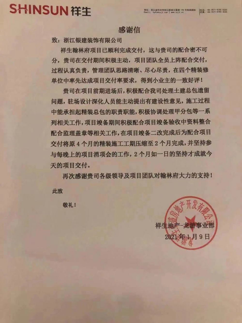 2021年1月19日,我司承接的“龍游祥生翰林府大區(qū)住宅及公共區(qū)域精裝修 ”項目收到由龍游祥生弘盛房地產(chǎn)有限公司送來的“施工優(yōu)良 管理規(guī)范”鮮艷錦旗、榮譽證書和感謝信。以感謝“龍游祥生翰林府大區(qū)住宅及公共區(qū)域精裝修”項目部工作人員在項目中優(yōu)質(zhì)施工、盡心盡責(zé)的服務(wù)!